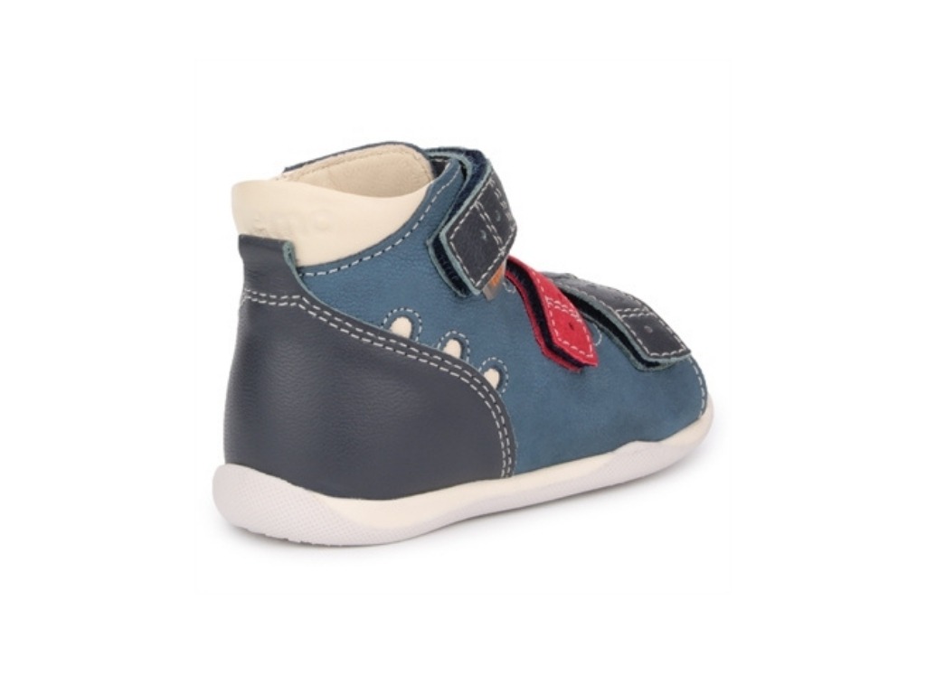 Dino Blue är speciellt framtagen för barn som tar sina första steg. Den höga konstruktionen tillsammans med en fast och stabil hälkappa hjälper till att hålla foten i rätt position och ger optimal stabilisering av ankeln. Skon är tillverkad i mjukt men slitstarkt naturmaterial, med vadderade partier för extra komfort, är sandalen skonsam mot känsliga små fötter samtidigt som den klarar aktiv lek.